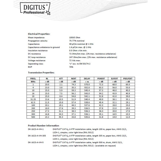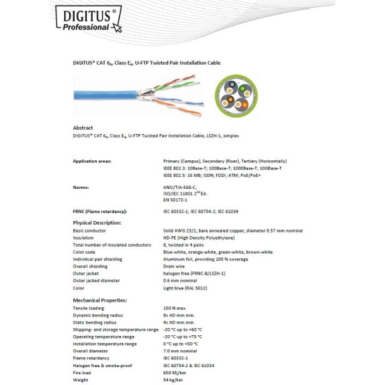 DIGITUS CAT 6A U-FTP Kábel 4x2,drôt AWG23, LSOH, modrý, 305m - 4x2 AWG23 drôt, čístá meď - Kategória CAT6A vyhovuje normám ISO/IEC 11801, TIA/-586-C.2, EN 50173 - Najvyšší podporovaný protokol: 1000BaseT, Gigabit Ethernet - 500MHz - Farebne odlíšené žily - Páry sú jednotlivé stínené hliníkovou fóliou - Celok je nestínený - Izolácia: SFS-PE - Plášť: LSOH - NVP: 70% - Zaťaženie: 150N max. - Dynamický polomer v ohybe: 8x AD mm min. - Statický polomer ohybu: 4x AD mm min. - Skladovacia teplota: -20°C až 60°C - Teplota pri inštalácii: 0°C až 50°C - Farba plášťa: svetlo modrá - Dĺžka kábla v balení: 305m na drevenej cievke Inštalačný kábel CAT6A zaručuje dlhú životnosť, maximálny výkon a bezproblémový chod počítačovej siete. Inštalačný kábel - CAT6A je určený pre horizontálne rozvody a bez problémov spĺňa požiadavky definované v medzinárodných štandardoch ISO/IEC 11801, TIA/-586-C.2, EN 50173 pre CAT6A a je preto vhodný aj pre prevádzku tých najnáročnejších protokolov určených pre štruktúrovanú kabeláž. e preto vhodný aj pre prevádzku tých najnáročnejších protokolov určených pre štruktúrovanú kabeláž.