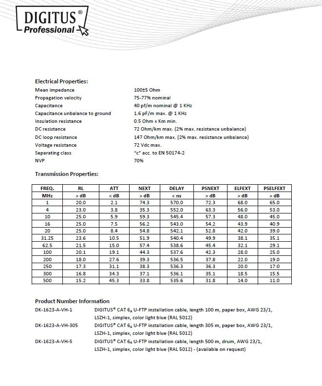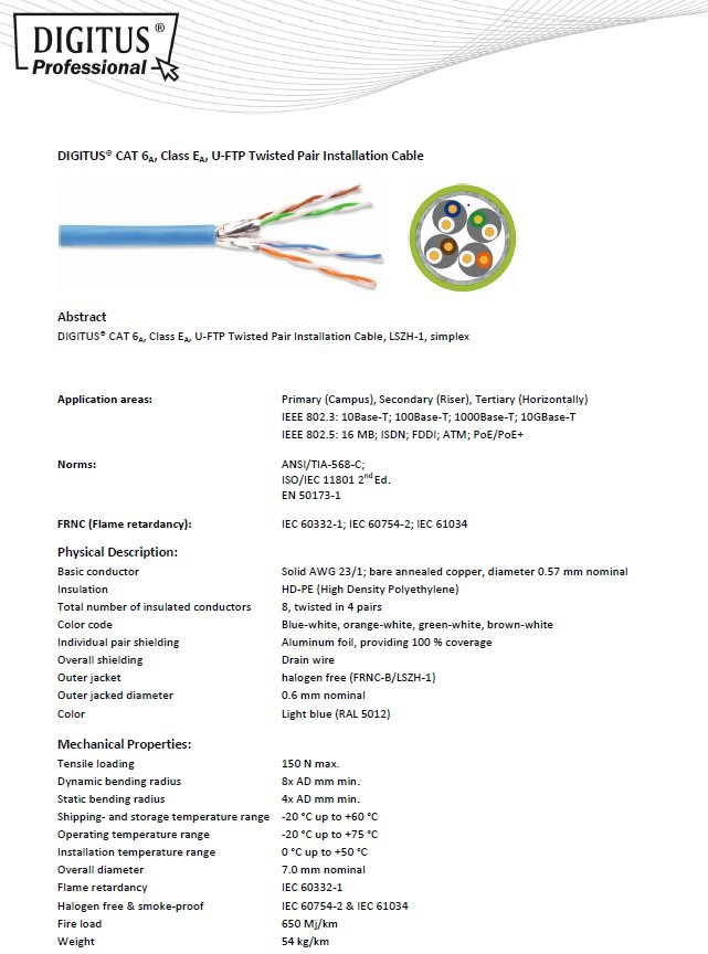 DIGITUS CAT 6A U-FTP Kábel 4x2,drôt AWG23, LSOH, modrý, 305m - 4x2 AWG23 drôt, čístá meď - Kategória CAT6A vyhovuje normám ISO/IEC 11801, TIA/-586-C.2, EN 50173 - Najvyšší podporovaný protokol: 1000BaseT, Gigabit Ethernet - 500MHz - Farebne odlíšené žily - Páry sú jednotlivé stínené hliníkovou fóliou - Celok je nestínený - Izolácia: SFS-PE - Plášť: LSOH - NVP: 70% - Zaťaženie: 150N max. - Dynamický polomer v ohybe: 8x AD mm min. - Statický polomer ohybu: 4x AD mm min. - Skladovacia teplota: -20°C až 60°C - Teplota pri inštalácii: 0°C až 50°C - Farba plášťa: svetlo modrá - Dĺžka kábla v balení: 305m na drevenej cievke Inštalačný kábel CAT6A zaručuje dlhú životnosť, maximálny výkon a bezproblémový chod počítačovej siete. Inštalačný kábel - CAT6A je určený pre horizontálne rozvody a bez problémov spĺňa požiadavky definované v medzinárodných štandardoch ISO/IEC 11801, TIA/-586-C.2, EN 50173 pre CAT6A a je preto vhodný aj pre prevádzku tých najnáročnejších protokolov určených pre štruktúrovanú kabeláž. e preto vhodný aj pre prevádzku tých najnáročnejších protokolov určených pre štruktúrovanú kabeláž.
