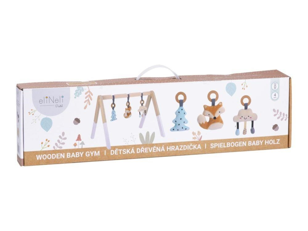 Drevná detská hrazdička so zavesenými hračkami v podobe roztomilej líštičky, stromčeka a obláčika upúta pozornosť každého bábätka. Detská hrazdička v neutrálnych farbách, vhodná pre dievčatká aj chlapcov, stimuluje detské zmysly, motivuje bábätká k pohybu a prieskumu zavesených prvkov. Každú z mäkkých hračiek môžete zo drevnej hrazdičky sundat a použiť ako samostatné hračky.