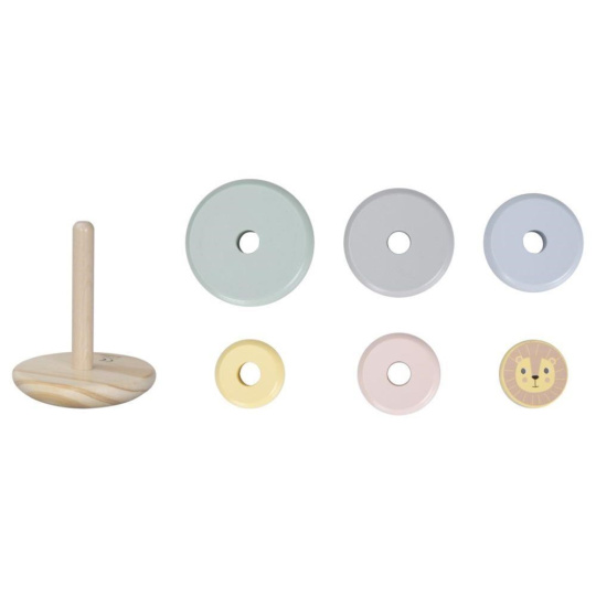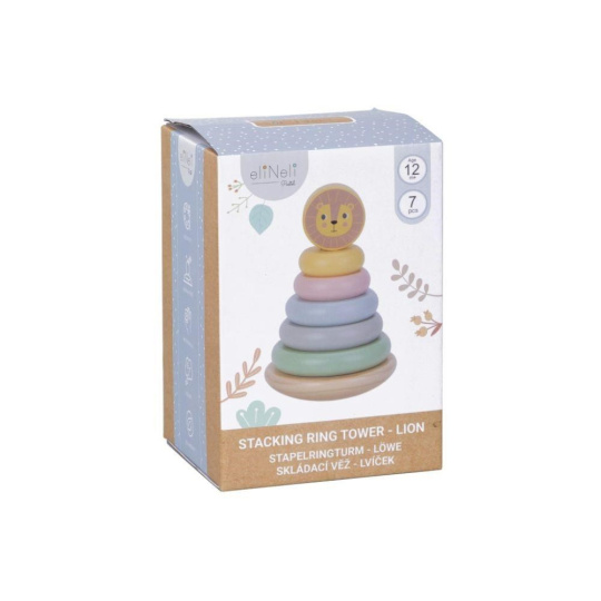 Skládacia veža (pyramída) je obľúbená drevená hračka, ktorá nesmie chýbať v žiadnom detskom kráľovstve. Skládacia veža s kruhmi v jemných pastelových farbách a levíčkom zdokonaľuje jemnú motoriku, koordináciu očí a rúk, logické myslenie, učí deti rozpoznávať rozdiel medzi väčším a menším, sústrediť sa a trpezlivosti.