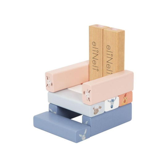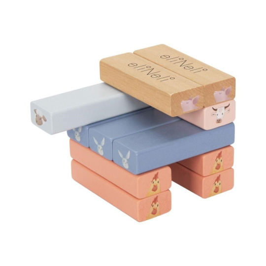 Drevená skladacia veža Jenga v príjemných pastelových farbách, s motívom zvieratiek z farmy, s bohatým príslušenstvom, je zábavnou hrou pre deti aj celú rodinu. Skladacia veža ponúka veľa možností na hru s rôznou úrovňou obtiažnosti. Tieto najmenšie deti sa hrám s drevenými kockami, väčšie deti postavia vežu a pokúsia sa vytiahnuť kocky s motívom zvieratka, ktoré padlo na kocke alebo si vylosovali z kartičiek a tí najväčší šikulovia môžu kocky z veže vytĺkať kladivkom.