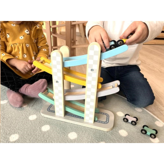 Závodná dráha so 4 závodnými autíčkami pre deti, vyrobená z prírodného dreva, v jemných pastelových farbách, je zábavnou hračkou pre chlapcov, dievčatá aj celú rodinu. Stačí správne položiť jedno zo závodných autíčok na začiatok závodnej dráhy (na najvyššie patro autodráhy) a potom sledovať, s akou úžasnou rýchlosťou prekoná všetky nižšie patra, až dorazí do úplného cieľa. Pri hre s autodráhou si deti precvičia jemnú motoriku, koordináciu očí a rúk, sústredenie, trpezlivosť a prebúdzajú v sebe prirodzenú súťaživosť. Zorganizujte u vás doma preteky, pri ktorých si užijete veľa zábavy. Zo závodných autíčok v krásnych farbách si svojho favorita vyberie každý, stačí vziať stopky do ruky a preteky môžu začať.