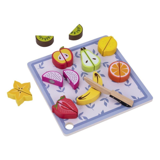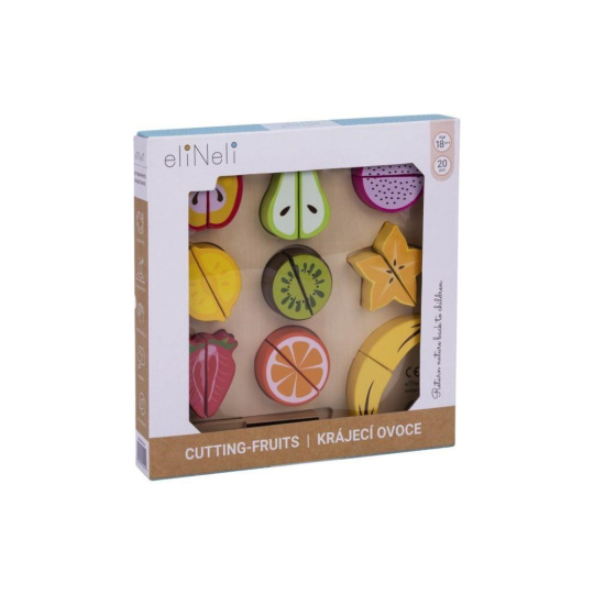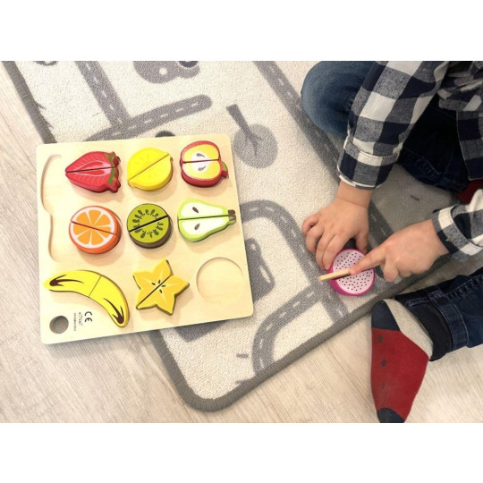 Drevené ovocie na krájanie je hračka, ktorá by nemala chýbať v žiadnej detskej kuchynke ani detskom obchode. Táto činnosť je pre deti úplne bezpečná. Polovice ovocia sú spojené suchým zipsom, vďaka čomu deti ľahko ovocie dreveným nožom rozrežú. Balenie obsahuje 9 druhov ovocia, drevenú doštičku aj drevený nôž.