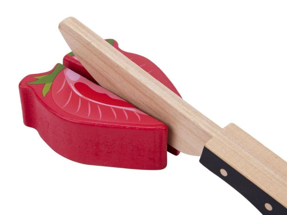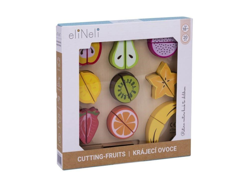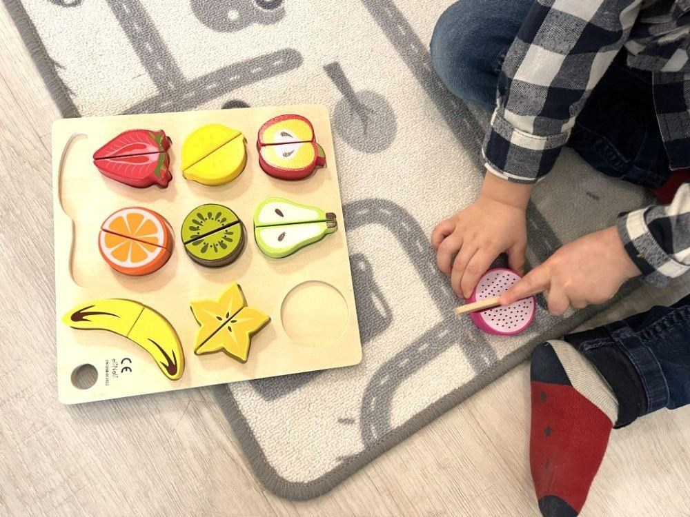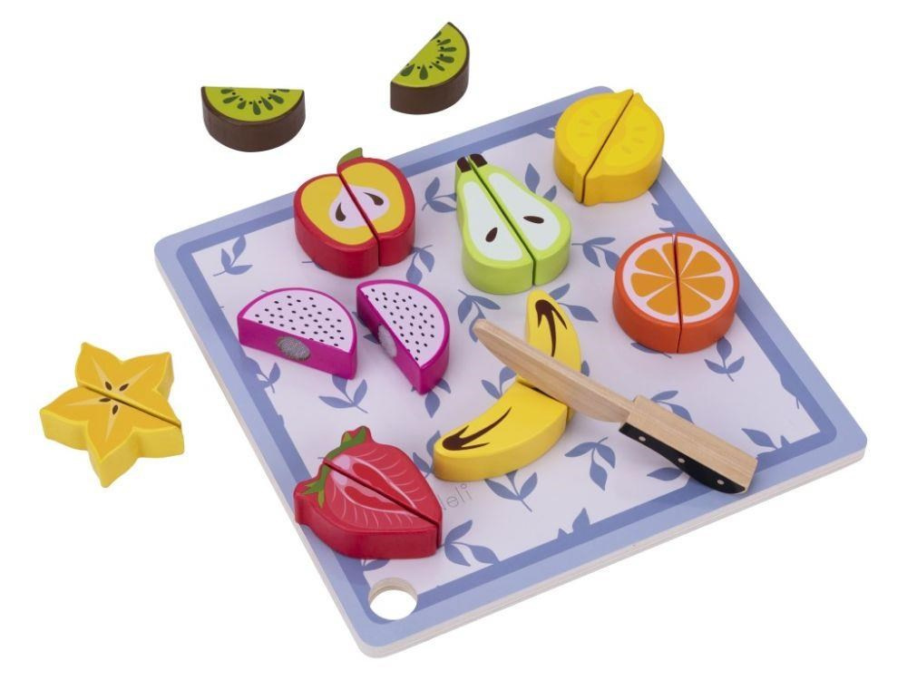 Drevené ovocie na krájanie je hračka, ktorá by nemala chýbať v žiadnej detskej kuchynke ani detskom obchode. Táto činnosť je pre deti úplne bezpečná. Polovice ovocia sú spojené suchým zipsom, vďaka čomu deti ľahko ovocie dreveným nožom rozrežú. Balenie obsahuje 9 druhov ovocia, drevenú doštičku aj drevený nôž.
