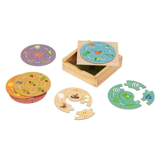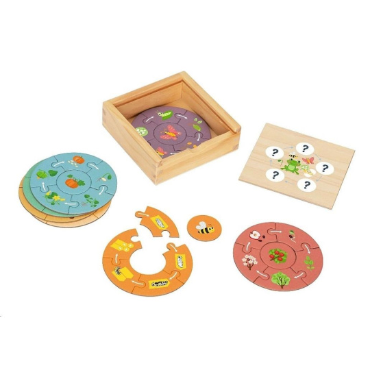 Drevené puzzle s originálnym motívom cyklu života rastlín i zvieratiek bude úžasnou hračkou pre deti od 3 rokov. Osem kruhových puzzle skladačiek so šiestimi dielmi deti zoznámi s podobou rastlín a zvieratiek, od samotného začiatku až po ich zrelosť a dospelosť. Všetko, čo sa deti pri skladaní naučia, môžu neskôr pozorovať vonku, napríklad pri prechádzkach, na záhrade alebo počas prázdnin u babičky. Deti pochopia princíp starnutia a kolobeh života nielen včielky, žabky, motýlika, vtáčika, slnečnice, jablone, tekvice a paradajky, ale začnú si všímať zmeny rastlín a zvierat vo svojom okolí.