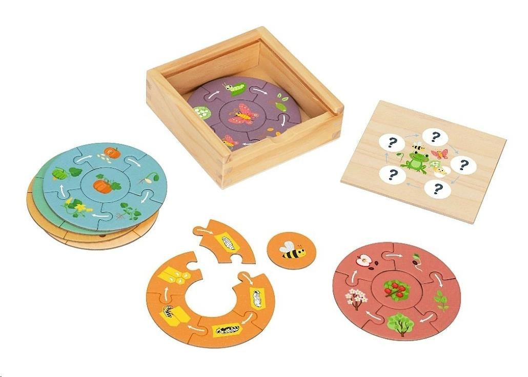 Drevené puzzle s originálnym motívom cyklu života rastlín i zvieratiek bude úžasnou hračkou pre deti od 3 rokov. Osem kruhových puzzle skladačiek so šiestimi dielmi deti zoznámi s podobou rastlín a zvieratiek, od samotného začiatku až po ich zrelosť a dospelosť. Všetko, čo sa deti pri skladaní naučia, môžu neskôr pozorovať vonku, napríklad pri prechádzkach, na záhrade alebo počas prázdnin u babičky. Deti pochopia princíp starnutia a kolobeh života nielen včielky, žabky, motýlika, vtáčika, slnečnice, jablone, tekvice a paradajky, ale začnú si všímať zmeny rastlín a zvierat vo svojom okolí.