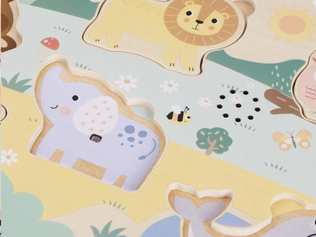 Zvukové vkladacie puzzle s obľúbenými zvieratami - levom, tigrom, slonmi, lachtanom, opičkou a papagájom, zavedie deti do ZOO. S drevenými puzzle dielikmi v podobe zvierat deti potrénujú motorické zručnosti, koordináciu očí, logické myslenie, stimulujú zmysly, naučia sa trpezlivosti, sústrediť sa a ešte si užijú veľa zábavy.