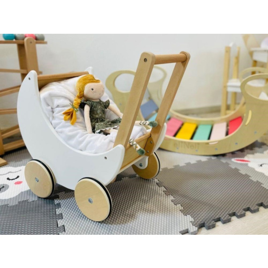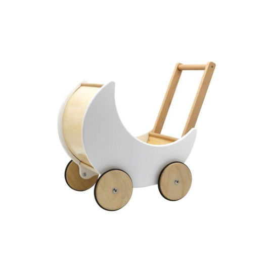 Designový kočárek ve tvaru mesiačika, vyrobený z prírodného dreva, je ako stvorený pre krátke aj dlhé prechádzky, uspávanie obľúbených bábik alebo plyšákov. Drevený kočík dobre padne do detskej ruky, ľahko sa riadi a ovláda. Kočík pre bábiky zaparkovaný v detskom kráľovstve vašej princeznej je súčasne aj krásnou dekoráciou.