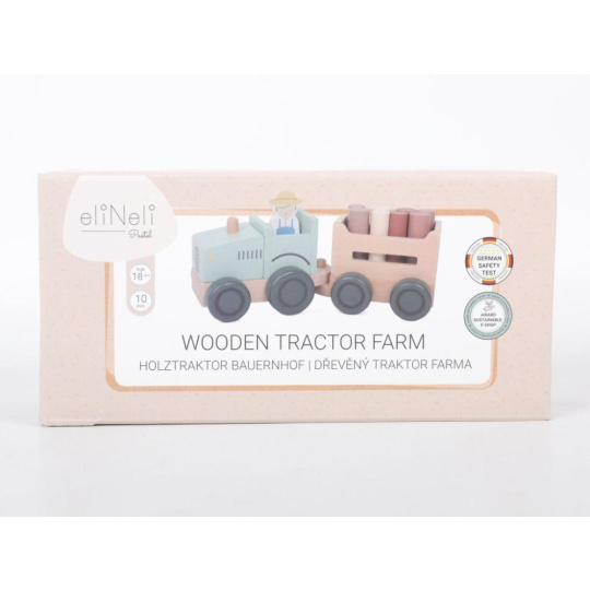 Parádny drevený traktor v jemne zelenkavej farbe, s traktoristom, ťahúňou a nákladom v podobe klátov (drevených valčekov), premení deti na skutočných farmárov. S týmto dreveným traktorom sa deti vyberú do lesa na drevo, môžu prepravovať zvieratá z farmy a akékoľvek iné hračky, kocky, čo sa im podarí naložiť na vlečku. Pri hre s traktoríkom deti hrajú role, zdokonaľujú motorické zručnosti a koordináciu očí a rúk.