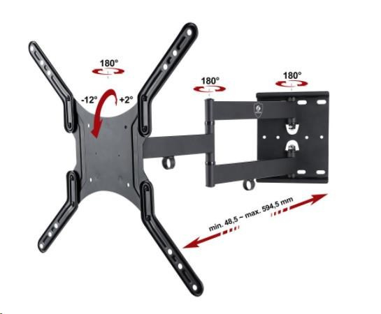 Polohovateľný držiak TV 23-55", dĺžka až 60cm, otočný, sklopný, nosnosť 45kg Nástenný držiak vynikajúcej kvality, na LCD, LED, 3D, Smart televízie 23" až 55". Vynikajúci pomer nastavenia vzdialenosti od steny: 48mm až 595mm. Robustná odolná konštrukcia držiaka zvládne zavedenie televízorov s hmotnosťou až 45kg. Televízor je po zavedení na držiak možné otáčať oboma smermi, naklápať, odsúvať a prispôsobovať k stene, korigovať rovinu TV. Na ramenách sú úchyty na káble. Nástenný úchyt umožňuje mnoho spôsobov montáže na stenu. Držiak je dodávaný v čiernom prevedení, v balení nájdete montážny materiál a prehľadný návod v CZ. Záruka 3 roky. Držiak ErgoSolid Telfor - skvelá kvalita a vynikajúci pomer nastavenia vzdialenosti od steny 48mm až 595mm, nosnosť 45kg Technické údaje: nosnosť 45kg podpora VESA štandardu pre zavedenie TV a monitorov 100x100 až 400x400 odporúčame na televízory a monitory s uhlopriečkou 23" až 55" nastavenie vzdialenosti od steny 48mm až 595mm nastavenie sklonu v rozmedzí +2° až -12° otáčanie na obidve strany až +/- 90° korekcia roviny obrazovky +2° až -2° veľmi pevná, robustná konštrukcia úchyty na káble montážny materiál farebné prevedenie čierne záruka 3 roky Držiak ErgoSolid Telfor podporuje VESA štandardy pre zavedenie TV 23-55": VESA 100x100 VESA 200x100 VESA 200x200 VESA 200x300 VESA 200x400 VESA 300x200 VESA 300x300 VESA 400x200 VESA 400x400 Držiak nepodporuje VESA 75x75 a 400x300