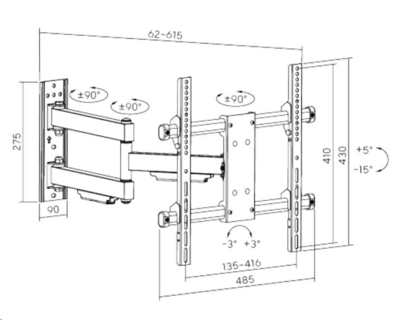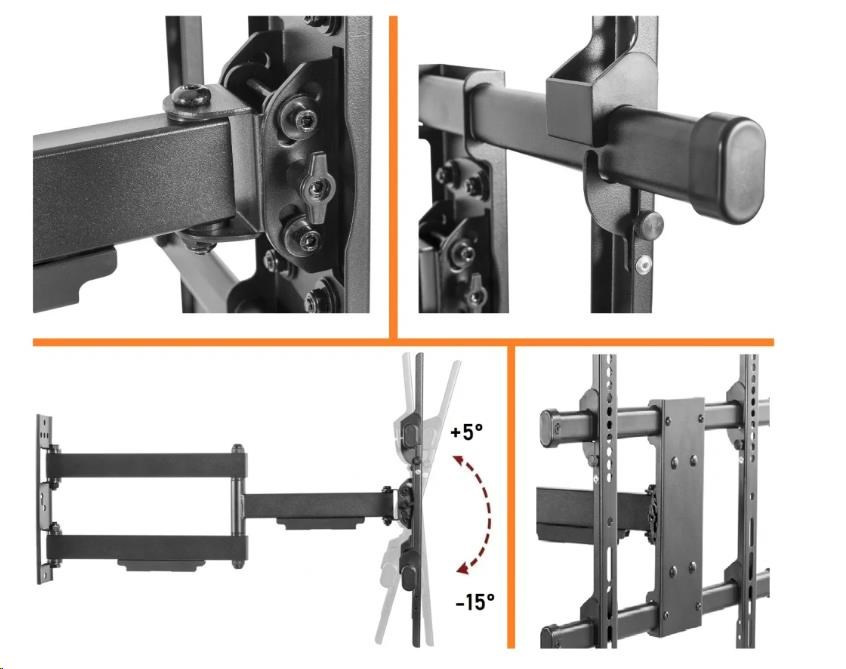 Otočný sklápací výsuvný držiak TV Fiber Mounts RAPTOR Kvalitný držiak TV 43" - 60", vzdialenosť od steny 62 - 615mm, otočný až +90° / -90°, naklápanie +5° / -15°, kvalitná pevná konštrukcia, úchytky na káble, montážny materiál, VESA 200x100 až 400x400, nosnosť 50kg, záruka 10 rokov Kvalitný nástenný držiak na televíziu Fiber Mounts RAPTOR Predstavujeme Fiber Mounts RAPTOR - kvalitný držiak na televíziu, ktorý premení váš obývací priestor na dynamické multimediálne centrum. S Fiber Mounts RAPTOR sa každý filmový večer stane nezabudnuteľným zážitkom, a každý športový prenos bude taký živý, akoby ste boli priamo na štadióne. Nenechajte sa viazať statickým umiestnením vašej televízie. Vďaka otočnému mechanizmu +90° / -90° a naklápaniu +5° / -15° si môžete obrazovku nastaviť presne podľa vašich potrieb. Či už sledujete obľúbený film z pohodlia gauča, kresla alebo potrebujete upraviť uhol pohľadu na videohovor, Fiber Mounts RAPTOR vám to umožní s ľahkosťou. Okrem toho, s vzdialenosťou od steny 62 - 615mm, Fiber Mounts RAPTOR poskytuje nielen flexibilitu v umiestnení, ale aj jednoduchý prístup k zadným portom vašej televízie pre rýchle pripojenie alebo odpojenie zariadení. A vďaka pevnej konštrukcii a nosnosti až 50kg môžete mať istotu, že váš 43" - 60" televízor bude v bezpečí. Nezabudli sme ani na estetickú stránku. S úchytkami na káble bude váš obývací priestor vždy vyzerať uprataný a organizovaný, bez rušivých káblov visiace z televízie. A s priloženým montážnym materiálom a zárukou 10 rokov je montáž a používanie Fiber Mounts RAPTOR hračka. Televízny držiak kvalitnej robustnej konštrukcie Fiber Mounts RAPTOR Technické údaje: nosnosť 50kg podpora VESA štandardov pre zavešenie TV 200x100 až 600x400 ideálny na televízie a obrazovky s uhlopriečkou 43" až 60" nastaviteľná vzdialenosť od steny 62 - 615mm otáčanie obrazovky do strán až +90° / -90° naklápanie +5° / -15° korekcia roviny obrazovky +3° / -3° kvalitná veľmi pevnú konštrukciu úchytky na káble nástenný úchyt o rozmeroch 275 x 90mm farebné prevedenie čierne záruka 10 rokov
