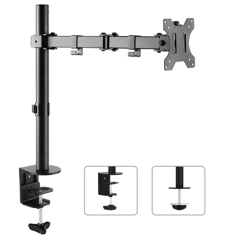 Držiak monitora na stôl Fiber Mounts M7C53 Stolový držiak na monitory 13-32", otočný +/-180°, náklon +/-45°, výškové polohovanie 0-400mm, vedenie kábla, 2 typy stolových uchytov, VESA 75x75 a 100x100, nosnosť 8kg Kvalitný držiak na monitor s uchytením na stolovú dosku - 2 typy uchytení súčasťou balenia. Držiak umožňuje monitor po zavedení výškovo polohovať, otáčať bez obmedzenia do strán, nakláňať. Držiak podporuje VESA štandardy 75x75 a 100x100, nosnosť je 8kg. Farebné prevedenie čierne. Balenie obsahuje inštalačný materiál. Kvalitný polohovateľný stolový držiak na monitor Fiber Mounts M7C53 vám umožní monitor otáčať do strán, nakláňať ho, vysúvať dopredu alebo zasúvať ku uchyteniu, výškovo polohovať. Technické údaje: nosnosť 8kg na monitory s uhlopriečkou 13" až 32" (33cm až 82cm) držiak podporuje VESA štandardy 75x75 a 100x100 maximálna vzdialenosť od nosníka 459mm nastavenie vzdialenosti od nosníka podľa potreby otáčanie do strán podľa potreby +/- 180° nastavenie náklonu +/- 45° súčasťou balenia sú 2 typy uchytení na stolovú dosku úchytky na káble spoľahlivá kvalita farebné prevedenie čierne záručná doba 5 rokov Držiak monitora Fiber Mounts M7C53 podporuje VESA štandardy: VESA 75x75 VESA 100x100
