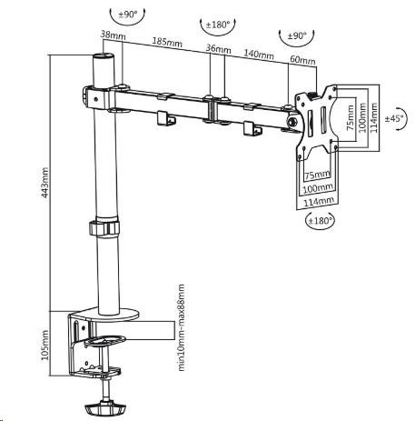 Držiak monitora na stôl Fiber Mounts SDM753 Výškovo nastaviteľný, otočný, sklopný stolový držiak na monitor 13-32" Lacný ale kvalitný držiak na monitor s uchytením na stolovú dosku - 2 typy uchytenia súčasťou balenia. Držiak umožňuje monitor po zavešení výškovo polohovať, otáčať bez obmedzenia do strán, naklápať. Držiak podporuje VESA štandardy 75x75 a 100x100, nosnosť je 8kg. Čierne prevedenie. Balenie obsahuje inštalačný materiál. Technické údaje: nosnosť 8kg na monitory s uhlopriečkou 13" až 32" (33cm až 82cm) držiak podporuje VESA štandardy 75x75 a 100x100 maximálna vzdialenosť od nosníka 459mm nastavenie vzdialenosti od nosníka podľa potreby otáčanie do strán podľa potreby +/- 180° nastavenie náklonu +/- 45° súčasťou balenia sú 2 typy úchytov na stolovú dosku úchyty na káble solídna kvalita farebné prevedenie čierne záruka 2 roky