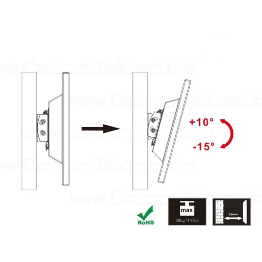 Nástenný držiak na monitory a menšie televízie 13-30", ktorý umožní nastavenie náklonu obrazovky +10°až -15°. Zavešenie monitoru alebo TV je veľmi jednoduché a rýchle, rovnako tak aj samotná inštalácia držiaka na stenu. Držiak podporuje VESA štandardy 75x75 a 100x100, nosnosť 20kg. Farebné prevedenie čierne, záruka 5 rokov.