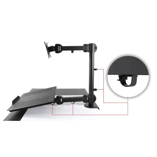 Držiak notebooku alebo laptopu a monitora Fiber Mounts FM23 Kvalitná zostava stolový držiak na monitor 15-27" a držiak na notebook laptop 13-17", polohovateľný, stabilný a pevný Vybavte si kanceláriu skvelým pomocníkom, ktorý vám ušetrí veľa miesta a zlepší ergonómiu pri práci. Zostava Fiber Mounts FM23 obsahuje držiak na monitory 15-27" a držiak na notebooky alebo laptopy s uhlopriečkou 13-17". Držiak monitora podporuje VESA 75x75 a 100x100, je možné ho otáčať do strán, nakláňať, rotovať a výškovo polohovať. Držiak notebooku je možné otáčať do strán a výškovo polohovať. Farebné prevedenie čierne, celková nosnosť 20kg, celokovová konštrukcia. Stolový držiak na monitor a notebook do vašej kancelárie - Fiber Mounts FM23 Technické údaje: nosnosť 20kg na monitory 15-27" na notebooky 13-17" VESA štandard 75x75 a 100x100 otáčanie do strán +/- 135° nakláňanie monitora +/- 90° upevnenie na stolovú dosku s hrúbkou 10-100mm farba čierna záručná doba 3 roky Stolový držiak na monitor a notebook do vašej kancelárie - Fiber Mounts FM23 Držiak na monitory podporuje štandardy VESA: VESA 75x75 VESA 100x100