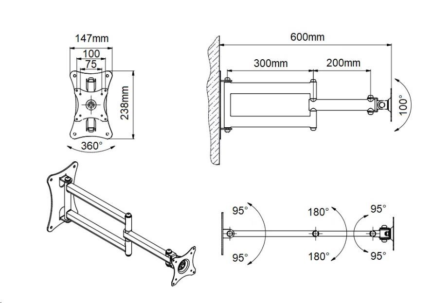 Kompletná špecifikácia Držiak TV alebo monitoru EDBAK GD26 Profesionálny držák na televízor alebo monitor 15-43", otočný, sklopný, dĺžkovo nastaviteľný, funkcia pivot, VESA 75x75 a 100x100, nosnosť 15kg Nástenný držák vynikajúcej kvality a robustnej konštrukcie pre zavesenie televízora alebo monitoru 15-43". Držiak podporuje VESA štandardy 75x75 a 100x100, je možné zakúpiť VESA rozšírenie na 200x100 a 200x200. Po zavedení TV na držiak môžete obrazovku otáčať na obidve strany aj kolmo ku stene, naklápať nahor a nadol, otočiť ju na šírku alebo na výšku. Vzdialenosť od steny je možné nastaviť v rozmedzí 90-600mm. Držiaky GD26 je možné zakúpiť vo troch farebných variantoch: čierny, strieborný alebo biely. Nosnosť držiaku je 15kg. Záruka 5 rokov. Polohovateľný otočný sklopný a dĺžkovo nastaviteľný držiak na LCD LED televízory a monitory - EDBAK GD26 / drzakyastolky.cz Technické údaje: nosnosť 15kg podporuje VESA štandardy 75x75 a 100x100 možnosť rozšírenia VESA štandardu na 200x100 alebo 200x200 za príplatok odporúčaná uhlopriečka televízora alebo monitora 15-43" nastaviteľná vzdialenosť od steny minimálna vzdialenosť 90mm maximálna vzdialenosť 600mm funkcia PIVOT - možnosť otáčania obrazovky okolo osi otáčanie do strán +/- 90° náklon +10° až -50° (možno aj obrátene, podľa montáže držiaka) jednoduchá a rýchla montáž profesionálna kvalita oceliová konštrukcia farba - čierna, strieborná alebo biela záruka 5 rokov