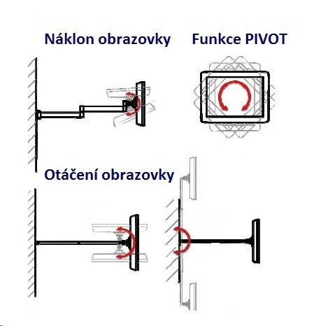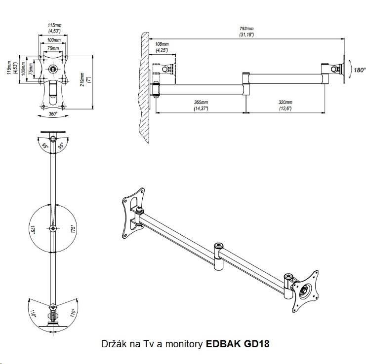 Kompletná špecifikácia Držiak TV alebo monitoru EDBAK GD26 Profesionálny držák na televízor alebo monitor 15-43", otočný, sklopný, dĺžkovo nastaviteľný, funkcia pivot, VESA 75x75 a 100x100, nosnosť 15kg Nástenný držák vynikajúcej kvality a robustnej konštrukcie pre zavesenie televízora alebo monitoru 15-43". Držiak podporuje VESA štandardy 75x75 a 100x100, je možné zakúpiť VESA rozšírenie na 200x100 a 200x200. Po zavedení TV na držiak môžete obrazovku otáčať na obidve strany aj kolmo ku stene, naklápať nahor a nadol, otočiť ju na šírku alebo na výšku. Vzdialenosť od steny je možné nastaviť v rozmedzí 90-600mm. Držiaky GD26 je možné zakúpiť vo troch farebných variantoch: čierny, strieborný alebo biely. Nosnosť držiaku je 15kg. Záruka 5 rokov. Polohovateľný otočný sklopný a dĺžkovo nastaviteľný držiak na LCD LED televízory a monitory - EDBAK GD26 / drzakyastolky.cz Technické údaje: nosnosť 15kg podporuje VESA štandardy 75x75 a 100x100 možnosť rozšírenia VESA štandardu na 200x100 alebo 200x200 za príplatok odporúčaná uhlopriečka televízora alebo monitora 15-43" nastaviteľná vzdialenosť od steny minimálna vzdialenosť 90mm maximálna vzdialenosť 600mm funkcia PIVOT - možnosť otáčania obrazovky okolo osi otáčanie do strán +/- 90° náklon +10° až -50° (možno aj obrátene, podľa montáže držiaka) jednoduchá a rýchla montáž profesionálna kvalita oceliová konštrukcia farba - čierna, strieborná alebo biela záruka 5 rokov