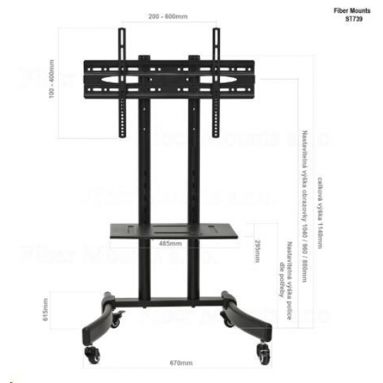 Technické údaje: maximálne zaťaženie vozíka 40kg maximálne zaťaženie police 5kg podpora VESA štandardu 200x100 až 600x400 odporúčané uhlopriečky televízora 32" až 65" celková výška stojanu 1140mm nastaviteľná výška obrazovky v 3 polohách 104 / 96 / 88cm (výška po stred televízora) polica na príslušenstvo o rozmeroch 485x295mm nastaviteľná výška police - možnosť demontáže pevný, stabilný podstavec o rozmeroch 670x615mm farebné prevedenie čierne ekonomické balenie o rozmeroch 1060x350x120mm a hmotnosti 15kg záruka 2 roky Vozík na televíziu Fiber Mounts ST739 podporuje VESA štandardy: VESA 200x100 VESA 200x200 VESA 300x200 VESA 300x300 VESA 400x200 VESA 400x300 VESA 400x400 VESA 600x400