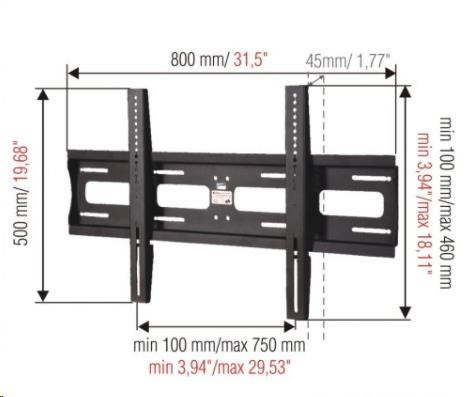 Technické údaje: nosnosť 80kg VESA štandard 100x100 - 720x460 odporúčame na televízory 37" až 60" vzdialenosť TV od steny 45mm vyrobené z kvalitnej silnostennej ocele jednoduchá inštalácia profesionálna kvalita certifikovaný držiak TV farebné prevedenie čierne alebo strieborné záruka 10 rokov DRŽIAK PODPORUJE VESA ŠTANDARDY: VESA 100x100 VESA 200x100 VESA 200x200 VESA 300x200 VESA 300x300 VESA 400x200 VESA 400x300 VESA 400x400 VESA 600x400 všetky atypické rozmery VESA štandardov až do rozmerov 700x460mm