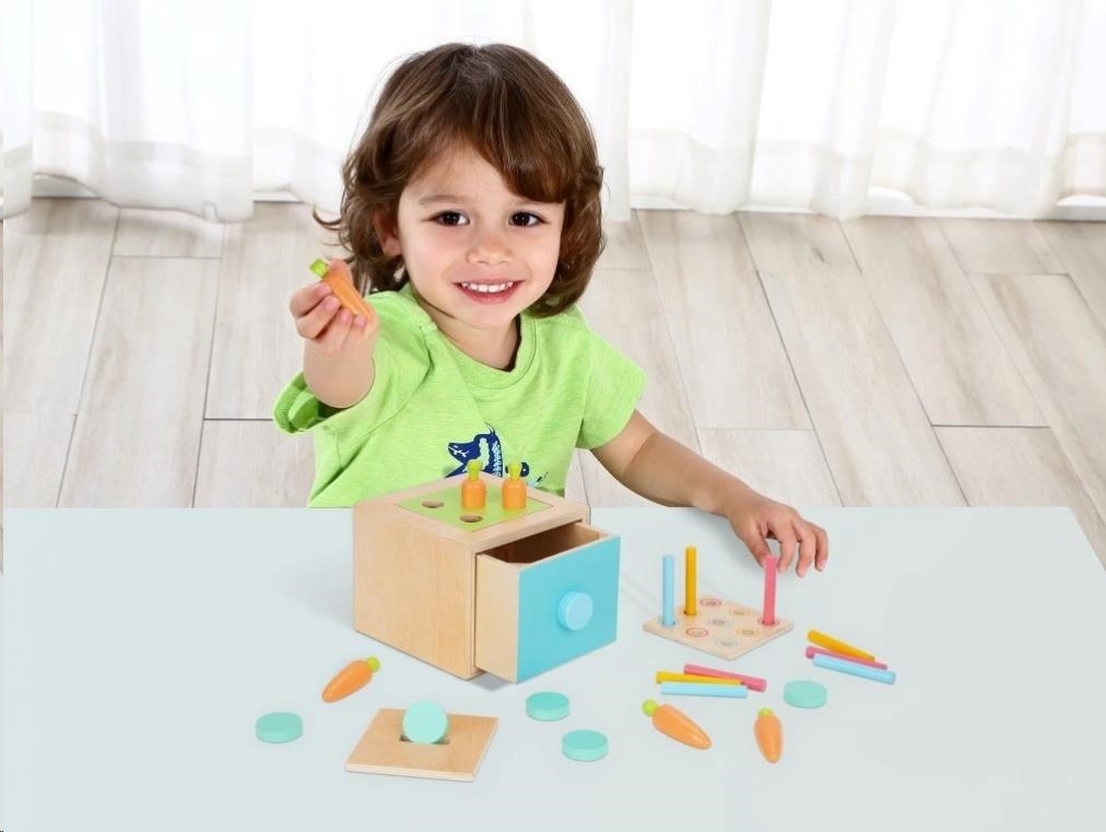 Drevená edukačná hračka (box), pre deti od 1 roka, predstavuje hneď 3 hračky v jednom. Multifunkčná bednička (box) s vymeniteľnou hornou časťou je zábavnou vkladačkou s mrkvičkami, s farebnými valčekmi alebo pokladničkou. Vďaka 3 vymeniteľným doskám môžu deti hrať rôzne hry, zdokonaľovať svoje zručnosti a užívať si veľa zábavy.