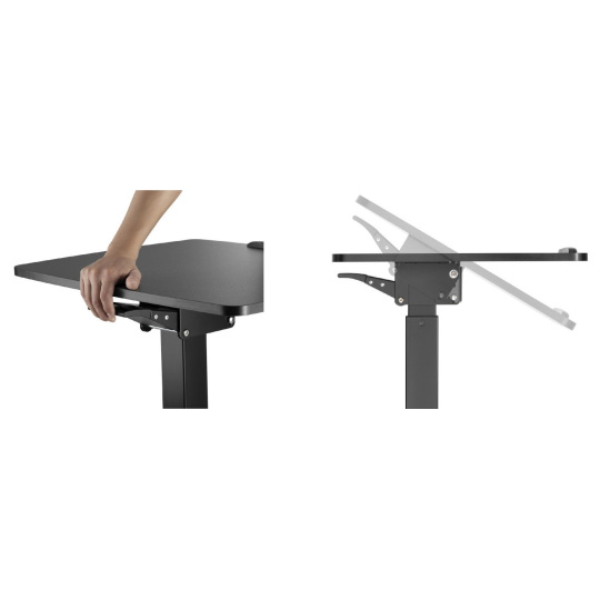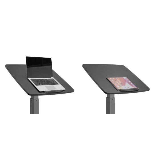 Stôl na notebook, laptop alebo projektor Fiber Mounts M8C92 výškovo nastaviteľný stôl na notebook, laptop alebo projektor, nakloniteľná pracovná doska 60*56cm s zabrzdou, nosnosť 8kg, pojazdové kolieska s brzdou Veľmi kvalitný a zároveň aj pekný pracovný stôl na notebooky alebo laptopy s možnosťou elektrického výšku nastavovania na prácu v sede alebo aj v stoji. Výškové nastavenie 758mm až 1128mm, tichý a rýchly chod, ovládanie nožnou pákou. Stôl je možné použiť aj na projektory a dataprojektory. Možnosť jednoduchého premiestnenia vďaka pojazdovým kolieskam s aretáciou. Pracovná doska je možné manuálne nakloniť z vodorovnej polohy až o 30°, rozmer pracovnej dosky je 600*560mm. Kvalitný povrchový povrch v decentnej čiernej farbe. Ideálny stôl do kancelárií aj domácností. Pracovný stolík do kancelárie alebo domácnosti, elektrické výškové polohovanie na prácu v sede alebo v stoji, na notebooky, laptopy alebo projektory Fiber Mounts M8C92Pracovný stolík do domácnosti alebo kancelárie Fiber Mounts M8C92 Technické údaje: nosnosť pracovnej dosky 8kg rozmerná pracovná doska 600x560mm elektrické nastavenie výšky stola 758-1128mm nožným pedálom tichý a rýchly chod možnosť manuálneho naklonenia pracovnej dosky 0° až -30° vynikajúca pevná konštrukcia kvalitný povrchový povrch v čiernom vyhotovení design vhodný ako do kancelárií tak aj do domácností možnosť práce na notebooku v sede alebo v stoji pojazdové kolieska s aretáciou záruka 2 roky