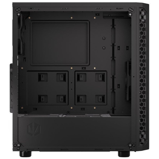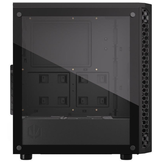 Skriňa formátu Middle Tower s priehľadnou bočnicou z tvrdeného skla ponúka dve 2,5" pozície pre SSD disky a dve 3,5" pozície pre pevné disky. Na hornej časti sa nachádza dva USB 3.0 porty, výstup na slúchadlá a vstup pre mikrofón. Vybavená je dvomi 120 mm ventilátormi, ktoré spolu s perforovaným čelným panelom zabezpečujú dostatočné prúdenie vzduchu. Dômyselné riešenie umožňuje pohodlné umiestnenie až 360 mm dlhého výmenníka vodného chladenia na prednej strane. V skrini je dostatok miesta pre chladič CPU do výšky až 161 mm a grafickú kartu s dĺžkou až 350 mm. Dodávaná je bez zdroja. Súčasťou je tiež sada prašných filtrov.
