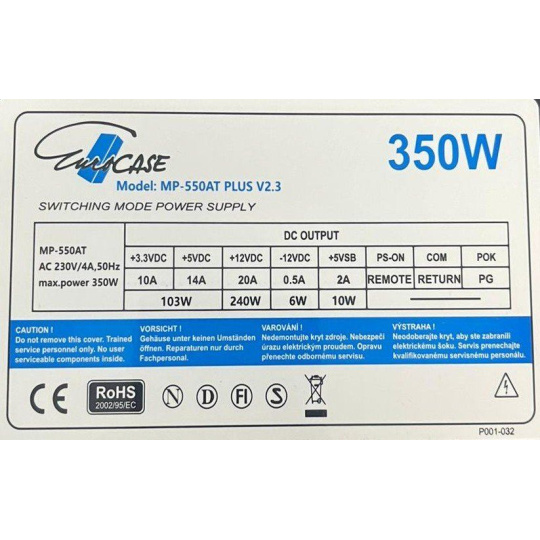Napájací zdroj ATX značky Eurocase s výkonom 350W. Je osadený 120mm ventilátorom a pasívnym PFC (Power factor correction). Otáčky ventilátora sú riadené termoreguláciou. Zdroj spĺňa požiadavky na elektrickú bezpečnosť a elektromagnetickú kompatibilitu. Zdroj vyhovuje aj smernici 2005/32/EU = príkon v pohotovostnom režime.