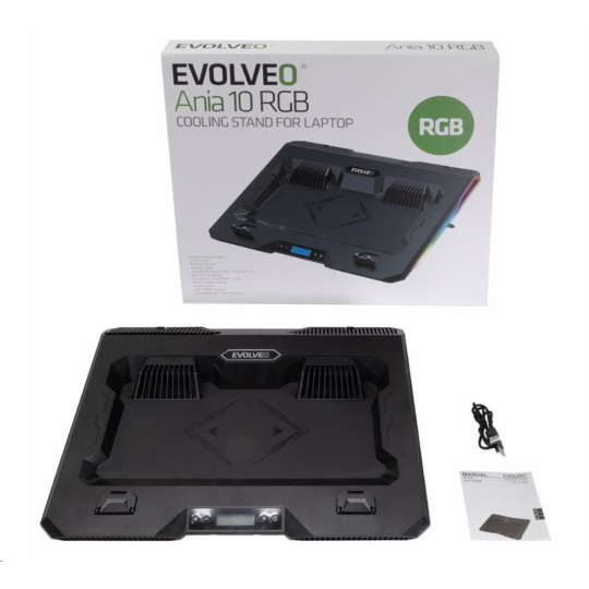 Chladiaca podložka EVOLVEO Ania 10 RGB s RGB podsvietením využijete pre notebooky o veľkosti 10-17". Bezbábežne oceníte možnosti nastavenia polohy a reguláciu otáčok ventilátora. Pomocou tlačidiel pri displeji je možné prepínať medzi tromi farebnými režimami (modrá, zelená a červená) a štyrmi RGB režimami, ktoré osvetľujú okraj podložky.