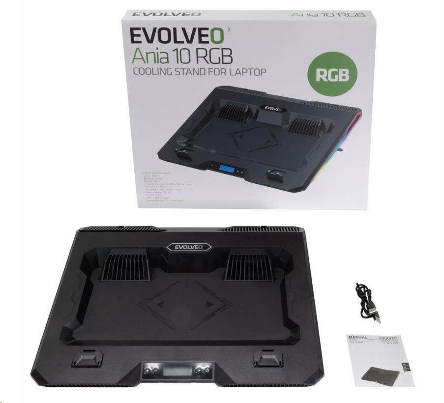 Chladiaca podložka EVOLVEO Ania 10 RGB s RGB podsvietením využijete pre notebooky o veľkosti 10-17". Bezbábežne oceníte možnosti nastavenia polohy a reguláciu otáčok ventilátora. Pomocou tlačidiel pri displeji je možné prepínať medzi tromi farebnými režimami (modrá, zelená a červená) a štyrmi RGB režimami, ktoré osvetľujú okraj podložky.
