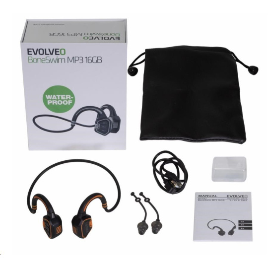 | Obsah balenia | EVOLVEO BoneSwim MP3 slúchadlá Ochranný prenosný obal Magnetický napájací kábel Ucpávky do uší v krabičke + uchytenie Užívateľský manuál |