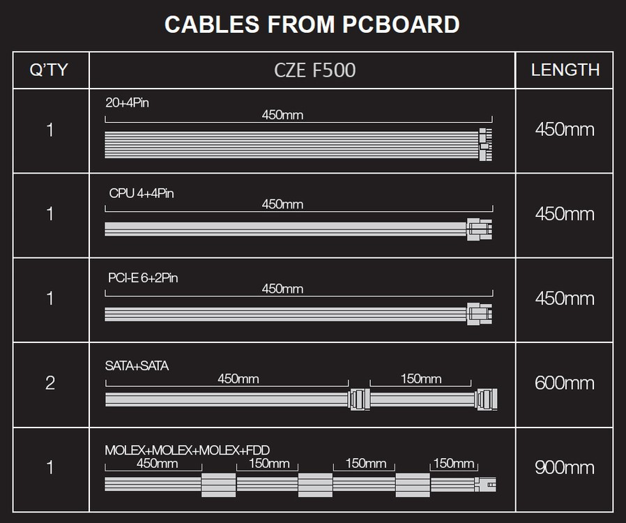 - 1x MOLEX, 450mm + MOLEX 150mm + MOLEX 150mm + FDD 150 mm