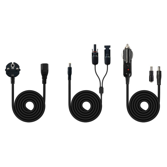 - Nabíjacie káble v balení: 1× do zásuvky 230 V, 1× do auta a 1× pre solárny panel