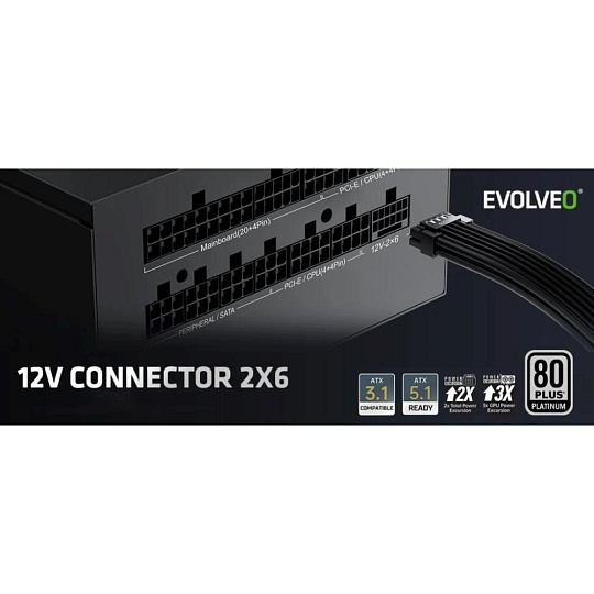 EVOLVEO P1000 zdroj 1000W, 80+ PLATINUM, ATX 3.1, aPFC, 140 mm ventilátor, 3 roky záruka, černý