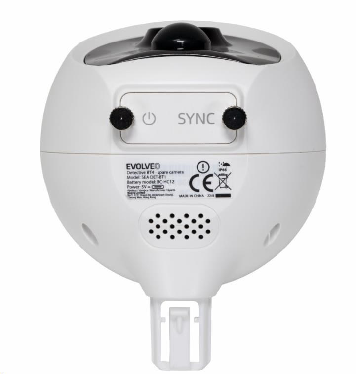 Náhradná kamera určená pre rozšírenie inštalácie EVOLVEO Detective BT4. Kamera je vybavená akumulátorom s kapacitou 5000mAh. Pod krytkou sa nachádza USB-C konektor pre nabíjanie a tlačidlo na zapnutie/vypnutie a párovací režim. Kamera je vybavená nočným IR prísvitom a PIR čidlom na rozpoznanie pohybu. Súčasťou kamery je aj mikrofón a reproduktor pre obojstrannú hlasovú komunikáciu.