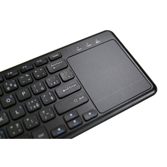 Všestrannosť 2.4GHz bezdrôtová klávesnica s touchpadom. Ideálne na ovládanie Smart TV, multimediálnych centier, počítačov HTPC atď. Ak chcete počítač ovládať na diaľku, môžete ho používať aj s prenosným alebo klasickým počítačom.