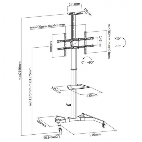 Exkluzívny mobilný stojan na televíziu Fiber Novelty FN5000 Televízny stojan vynikajúcej kvality a unikátnej konštrukcie, ktorá umožňuje plnú nastaviteľnosť polohy TV Veľmi pekný televízny stojan s unikátnou konštrukciou, vďaka ktorej veľmi ľahko nastavíte výšku televízora aj náklon, držiak má funkciu pivot, vďaka ktorej môžete dat obrazovku klasicky na šírku (horizontálne) alebo aj na výšku (vertikálne). Podstavec stojanu je osadený 4 kvalitnými pojazdovými kolieskami s brzdou, vďaka ktorým je stojan mobilný a ľahko manipulovateľný. Stojan sa dodáva vrátane príslušenstva - univerzálny držiak na televízory alebo monitory s uhlopriečkou 37-70", podporuje VESA štandard 200x200-600x400, poličkou na príslušenstvo a hornou poličkou na kameru alebo projektor. Obe poličky sú voliteľným príslušenstvom - na stojan ich môžete alebo nemusíte umiestniť. Nosnosť stojanu je 50kg, je veľmi stabilný a bezpečný. Vhodný na využitie na konferenciách, výstavách, prezentáciách, v kanceláriách, čakárňach, recepciách aj v domácnostiach. Farebné prevedenie čierne, záruka 3 roky. Exkluzívny stojan na televíziu alebo monitor, nastavenie výšky pomocou kliky bez náradia, nastavenie sklonu, funkcia pivot, polička na A/V a polička na kameru, stabilný, bezpečný, TOP kvalita - Fiber Novelty FN5000 Technické údaje: nosnosť 50kg podporuje VESA štandardy 200x200 až 600x400 univerzálny držiak na zavesenie TV alebo monitora s uhlopriečkou 37-70" plynulé nastavovanie výšky obrazovky pomocou kliky výškové nastavenie pomocou kliky, bez náradia, 1175mm až 1575mm možnosť náklonu obrazovky +10° až -10° funkcia PIVOT - rotácia obrazovky pre nastavenie do horizontálnej alebo vertikálnej polohy polička na A/V príslušenstvo s nosnosťou 5kg (inštalácia nie je nutná) rozmery A/V police 430x335mm polička na kameru alebo projektor s nosnosťou 4kg (inštalácia nie je nutná) rozmery hornej poličky 285x150mm robustný podstavec zabezpečí výbornú stabilitu a bezpečnosť rozmery podstavca 910x683mm pojazdové kolieska s brzdou zabezpečia skvelú mobilitu systém na fixáciu kabeláže na zadnej strane stojanu veľmi pekný dizajn unikátny systém pre ľahké a rýchle nastavenie výšky pomocou kliky montážny materiál (univerzálna sada skrutiek, podložiek na zavesenie obrazovky) farebné prevedenie čierne záruka 3 roky Stojan FN5000 je dodávaný vrátane držiaka na zavesenie TV alebo monitora s podporou VESA štandardu: VESA 200x200 VESA 300x200 a 200x300 VESA 300x300 VESA 400x200 a 200x400 VESA 400x300 a 300x400 VESA 400x400 VESA 600x400