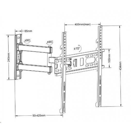 Technické údaje: nosnosť 30kg podporuje VESA štandardy 100x100 až 400x400 na všetky typy televízorov s uhlopriečkou 26-55" otáčanie na obe strany +/- 90° sklopenie obrazovky nahor alebo nadol +/- 15° nastavenie vzdialenosti od steny v rozmedzí 90-425mm zabezpečenie obrazovky proti vysadeniu kvalitná oceľová konštrukcia ukotvenie do steny na 3 hmoždinky inštalačný materiál súčasťou balenia farebné prevedenie čierne výborná kvalita záruka 3 roky Kĺbový držiak na TV FM761 podporuje VESA štandardy: VESA 100x100 VESA 200x100 a 100x200 VESA 200x200 VESA 300x200 a 200x300 VESA 300x300 VESA 400x200 a 200x400 VESA 400x300 a 300x400 VESA 400x400 Držiak nepodporuje VESA štandard 75x75, ktorý býva u najmenších televízorov a monitorov. Nástenný držiak FM761 je vhodný na zavŕšenie všetkých typov televízorov a monitorov, ktoré podporujú niektorý z vyššie uvedených VESA štandardov a ich hmotnosť nie je vyššia ako 30kg. Zavrieť môžete ako klasické rovné, tak aj zakrivené televízory a monitory. Na uhlopriečke televízora alebo monitora nezáleží, ak nie je prekročená nosnosť držiaka a váš TV podporuje niektorý z uvedených VESA štandardov, môžete zavrieť aj podstatne väčšie obrazovky.