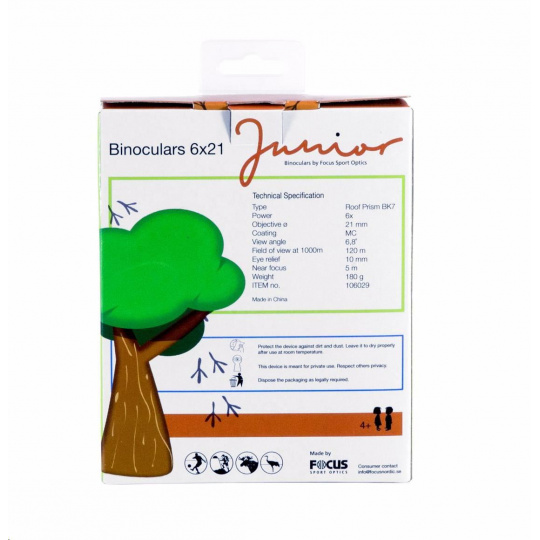 < p >Focus Junior 6x21 je perfektný binokulárny ďalekohľad, ktorý nesmie chýbať vo výbave žiadneho malého pozorovateľa.< /p >  < p >Výber zo dvoch farebných prevedení ocení nielen chlapci, ale aj odvážne dievčatá. Tento malý kapesný ďalekohľad je určený pre deti s rozsahom očí medzi 50 - 63 mm. Špeciálna konštrukcia s jedným centrálnym kĺbom zabezpečí ideálnu stabilitu.< /p >  < p >Veľké zaostrovacie koliesko uľahčuje úpravu ostrosti a povrchová úprava optiky poskytuje jasný obraz.< /p >  < p >Kaučukové telo je odolné voči nárazom a zároveň zabezpečuje bezpečné a príjemné uchopenie. Vďaka tomu sa vyhnete nechceným pádom z dôvodu nepríjemného držania, čo ocení každý rodič.< /p >  < p >Vďaka 6-násobnému zväčšeniu umožníte svojím deťom rýchlejšie a jednoduchšie zazrieť vtáky alebo iné zvieratá, ktoré deti jednoducho milujú.< /p >  < p >Balenie tiež obsahuje puzdro na opasok, nákrčník a čistiacu handričku na optiku.< /p >  < p >Švédska značka Focus Sport Optics vyrába optiku od roku 1985. Jej produkty sú v severských krajinách, kde je príroda nekompromisná, obľúbené vďaka skvelému pomeru ceny a výkonu.< /p >