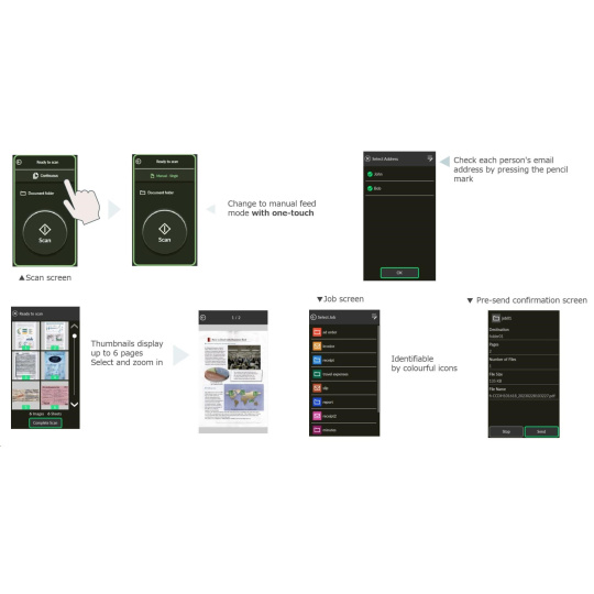 | Formáty výstupných súborov | PDF, Vyhľadateľný PDF, PDF/A, TIFF, Viacstránkový TIFF, Bitmap, JPEG, JPEG2000, PNG, Word, Excel, PowerPoint Pri použití DirectScan: len JPEG, PDF, Jednostránkový PDF | |
