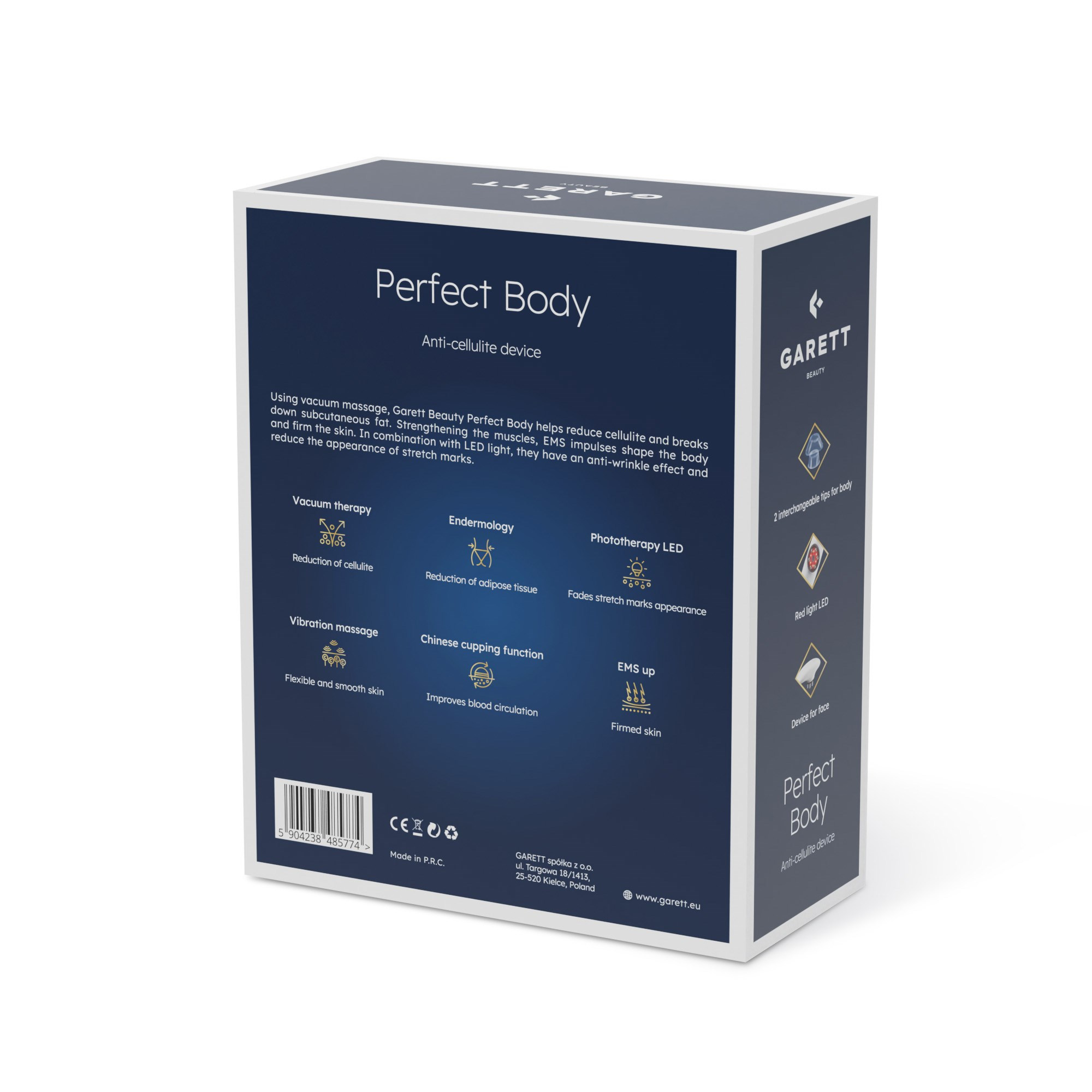 Ak hľadáte zariadenie, ktoré sa jednoducho ovláda a zároveň využíva najnovšie technologické poznatky, potom Garett Beauty Perfect Body splní vaše očakávania. Jednoduché ovládanie a ergonomický dizajn z neho robia ideálneho partnera pri starostlivosti o telo. Doplnkové funkcie – svetelná terapia a EMS prúdy sú ideálne na starostlivosť o tvár, stimulujú tvorbu kolagénových a elastínových vlákien, majú vysoko preventívne účinky proti tvorbe vrások a majú viditeľný efekt na zlepšenie kontúr tváre.