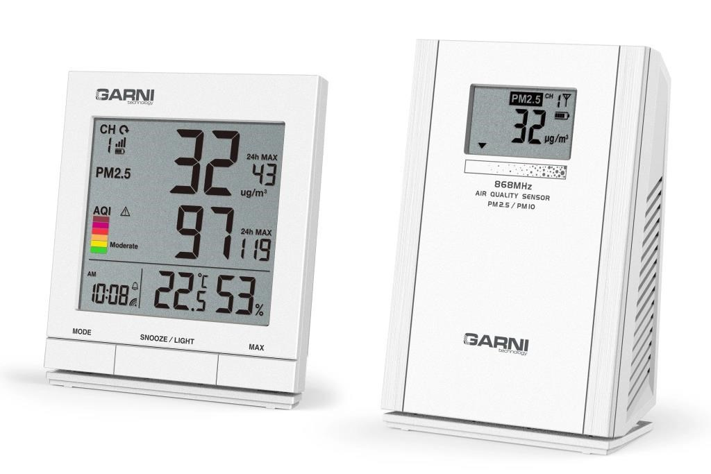Merač kvality ovzdušia GARNI 204 OneCare je určený na vnútorné použitie. Meria a zobrazuje na svojom LCD displeji hodnoty kvality ovzdušia – koncentráciu pevných častíc PM2.5 a PM10 nameranú bezdrôtovým senzorom GARNI 104Q (jeden bezdrôtový senzor je súčasťou balenia) a tiež teplotu a relatívnu vlhkosť. Pre meranie pevných častíc (PM) je použité švajčiarske čidl? SENSIRION radu SPS ? meranie pevných častíc (PM) PM2.5 a PM10 bezdrôtovým senzorom GARNI 104Q ? hlavná jednotka meria teplotu a relatívnu vlhkosť a zobrazuje hodnoty pevných častíc PM2.5, alebo PM10 namerané bezdrôtovým senzorom GARNI 104Q ? pre meranie pevných častíc sú použité presné švajčiarske čidlá SENSIRION radu SPS ? jednotkou PM sú µg/m3 ? prehľadný LCD displej hlavnej jednotky o rozmere 69 x 64 mm ? veľkosť číslic na displeji – čas 6,5 mm, teplota, relatívna vlhkosť 12 mm, aktuálna hodnota PM2.5, PM10 17 mm, maximálna hodnota 7 mm, aktuálna hodnota AQI 17 mm, maximálna hodnota 7 mm ? zobrazenie aktuálnych hodnôt PM2.5, PM10 a AQI, alebo priemerných hodnôt nameraných za 24 hodín ? indikácia kvality ovzdušia farebnou stupnicou AQI (Air Quality Index) a číselnou hodnotou AQI ? pamäť na maximálnu hodnotu PM2.5, PM10 a AQI od posledného vymazania pamäti, za poslednú hodinu a posledných 24 hodín alarm AQI upozorní na vysokú úroveň AQI na základe aktuálne nameranej hodnoty AQI alebo priemernej hodnoty za posledných 24 hodín. Jakmile je dosiahnutá hodnota, ktorá bola nastavená, aktivuje sa zvukové znamenie a na displeji hlavnej jednotky začne blikať ikona alarmu ? možnosť použitia až 4 bezdrôtových senzorov GARNI 104Q ? pri použití viacerých bezdrôtových senzorov GARNI 104Q možnosť automatického prepínania kanálov ? ikona signálu bezdrôtových senzorov ? čas riadený rádiovým signálom DCF-77 s možnosťou manuálneho nastavenia ? ikona prijmu signálu DCF-77 ? 12 alebo 24-hodinový formát zobrazenia času ? časová zóna -23 až +23 hodín ? zobrazenie teploty vo °C alebo °F ? automatické prepínanie letného a zimného času ? aktualizácia nameraných hodnôt – 60 sekúnd ? budík s funkciou Snooze (posunutie buzenia o 5 minút) ? možnosť krátkodobého osvetlenia displeja na 9 sekúnd ? ikona slabých batérií ? napájanie na batérie Bezdrôtové čidlo GARNI 104Q ? na vnútorné použitie ? displej o rozmere 37 x 21 mm ? veľkosť číslic 10 mm ? zobrazenie hodnoty kvality ovzdušia PM2.5 alebo PM10 ? 4 kanály ? zobrazenie čísla kanála, ikony slabých batérií, ikony vysielania a nabíjania na displeji ? vizualizácia kvality ovzdušia hodnotou koncentrácie na šestirúkovej stupnici ? aktualizácia a prenos nameranej hodnoty kvality ovzdušia pri napájaní USB adaptérom každých 60 sekúnd ? pri napájaní batériami meria bezdrôtové čidlo GARNI 104Q vo východiskovom nastavení koncentráciu PM2.5 a PM10 automaticky každých 10 minút. Pre maximalizáciu výdrže batérií je možné zmeniť interval merania z 10 minút na 20 alebo 30 minút ? dosah signálu až 100 m vo voľnom priestore ? frekvencia prenosu 868 MHz ? napájanie 3 x 1.2V NiMH nabíjacie batérie typu AA, alebo cez USB adaptér (adaptér nie je súčasťou balenia), nabíjanie cez USB (5V/1A) Obsah balenia 1 x hlavná jednotka 1 x bezdrôtové čidlo GARNI 104Q 3 ks nabíjacích batérií typ AA, 1,2 V, Ni-MH, 2000 mAh 1 x USB kábel 120 cm CZ, SK, EN návod, QR kód s odkazom na stiahnutie návodov DE, NL, PL, HU