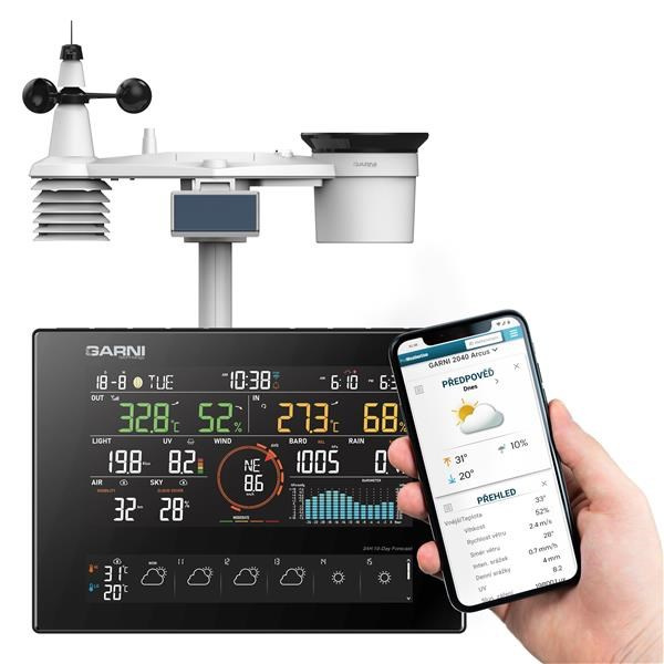 Meteorologická stanica s Wi-Fi, 24-hodinovou (predpoveď po hodine) / 10-dňovou predpoveďou a profesionálnym integrovaným bezdrôtovým čidlom 7-v-1 s solárnym panelom a vstavaným kapacitrom, model GARNI 2040 Arcus 2GEN, zhromažďuje presné a podrobné údaje o počasí, ktoré následne v reálnom čase nahráva pomocou vstavaného modulu Wi-Fi a miestnej Wi-Fi siete na meteorologický server ProWeatherLive. Ten umožňuje automatizované nahrávanie údajov z meteorologickej stanice a voľný prístup ku všetkým údajom odkiaľkoľvek, kde je prístup na internet, a to prostredníctvom webového prehliadača alebo mobilnej aplikácie. Súčasne server PWL odosiela do hlavnej jednotky informácie o dohľadnosti, oblačnosti a 24-hodinovej / 10-dňovej predpovedi počasia. Výrobok ponúka spoľahlivý výkon všetkým profesionálnym pozorovateľom a nadšencom, a to vďaka širokej škále nastavení a čidiel. Stanica vám poskytne miestnu predpoveď, maximálne a minimálne hodnoty a celkové hodnoty všetkých meteorologických veličín, to všetko bez potreby použitia stolného počítača.