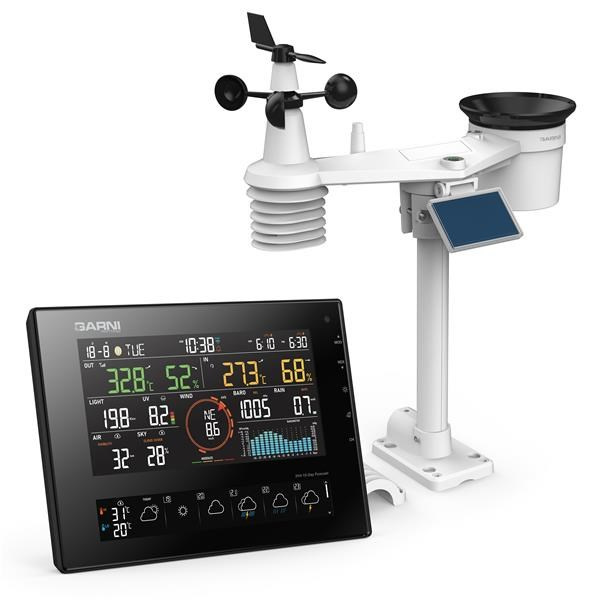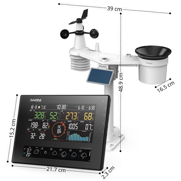 Integrované bezdrôtové čidlo 7-v-1 GARNI 1NG meria vonkajšiu teplotu a relatívnu vlhkosť, rýchlosť a smer vetra, dažďové zrážky, UV index a slnečné žiarenie, a dáta sú odosielané do hlavnej jednotky až do vzdialenosti 150 m (v otvorenom priestore). Napájanie zabezpečuje vstavaný kapacitor, ktorý je nabíjaný pomocou vstavaného solárneho panelu. Batéria slúži ako záložný zdroj. Čidlá sú úplne smontované a kalibrované, aby bola inštalácia čo najjednoduchšia. Hlavná jednotka je vybavená ľahko čitateľným displejom VA s ultračiernym pozadím a automatickou reguláciou jasu, ktorý okrem dát zo všetkých pripojených čidiel (napr. čidla na meranie teploty a relatívnej vlhkosti, bazénové čidlo, čidlo vlhkosti a teploty pôdy, čidlo detekcie búrok, čidlo kvality ovzdušia) zobrazuje predpoveď počasia, barometrický tlak, indikátory počasia spolu s pokročilými funkciami a informáciami, ako je výstražný alarm pre vysoké/nízke namerané hodnoty a stratu spojenia s čidlami prostredníctvom notifikácií v mobilnej aplikácii, a iné. Vysokorýchlostný procesor hlavnej jednotky analyzuje namerané hodnoty meteorologických veličín, vstavaná pamäť uchováva maximálne / minimálne namerané hodnoty za daný deň alebo od začiatku merania, a automaticky nastavuje čas a dátum z internetu. Jednoduché ovládanie, ľahká údržba, možnosť kalibrácie, zobrazenie času východu a západu Slnka a Mesiaca, zobrazenie fázy Mesiaca, automatická regulácia jasu displeja, množstvo meraných veličín a dlhodobá predpoveď robí z nej výnimočnú profesionálnu meteorologickú stanicu pre váš domov.