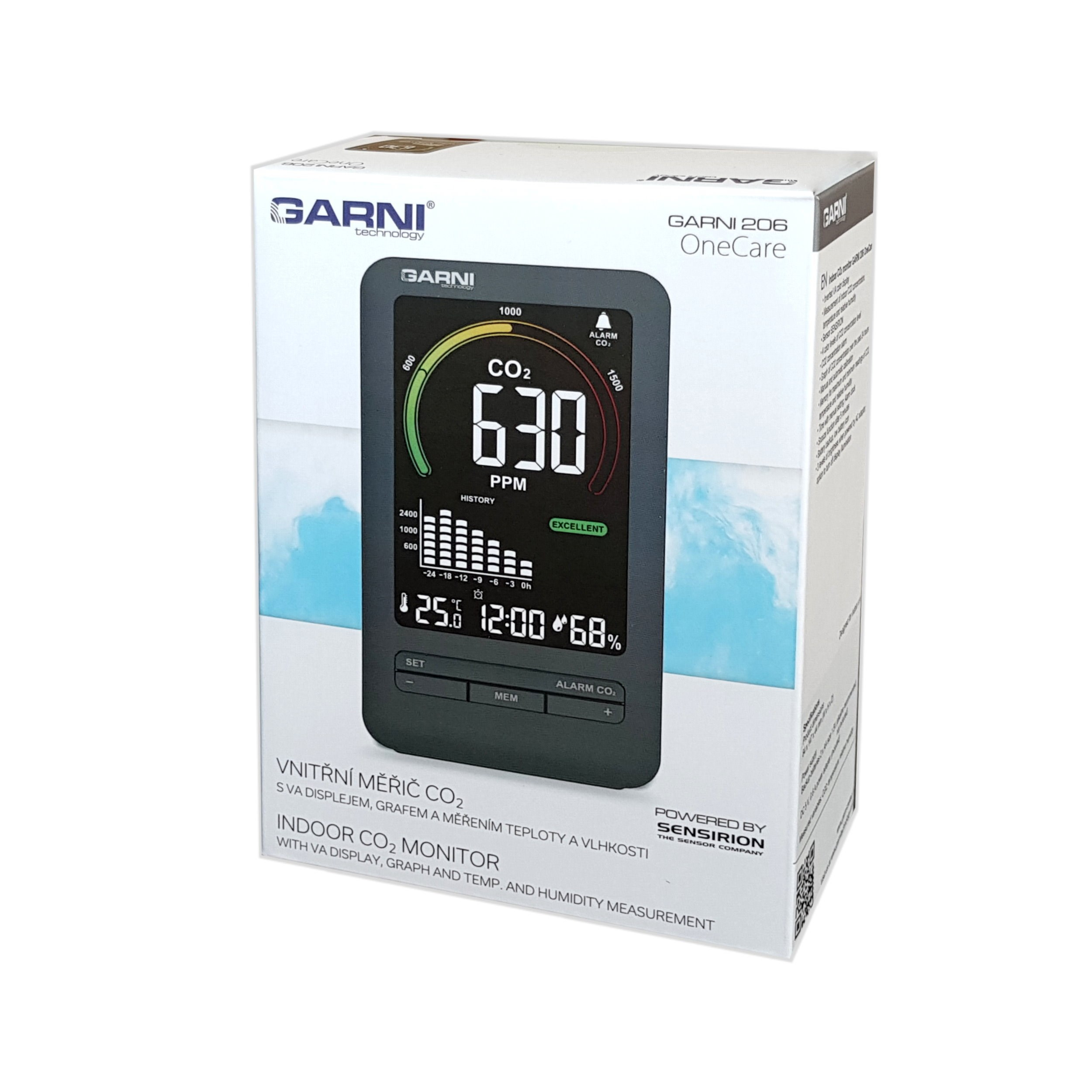 Merač CO2 (kysličníka uhličitého) GARNI 206 OneCare je určený na vnútorné použitie. Meria a zobrazuje na svojom farebnom inverznom VA displeji hodnoty CO2 vo vzduchu a tiež teplotu a relatívnu vlhkosť. Graf zobrazuje vývoj nameranej hodnoty CO2 za posledných 24 hodín. Na meranie CO2, teploty a relatívnej vlhkosti je použitý fotoakustický senzor SENSIRION radu SCD4x