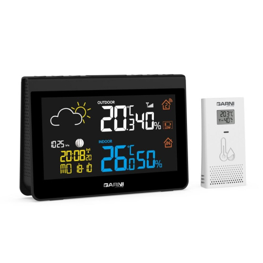 Presná meteorologická stanica s invertujúcim farebným VA displejom s časom a dátumom riadenými rádiovým signálom DCF-77, budíkom, meraním vnútornej teploty, relatívnej vlhkosti, barometrického tlaku a bezdrôtovým čidlom na meranie vonkajšej teploty a relatívnej vlhkosti. Na dosiahnutie vysokej presnosti merania teploty a relatívnej vlhkosti sú použité špičkové čidlá švajčiarskej značky SENSIRION