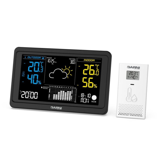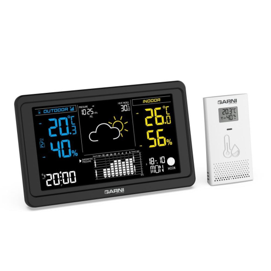Presná meteorologická stanica s invertujúcim farebným VA displejom s časom a dátumom riadenými rádiovým signálom DCF-77, budíkom, meraním vnútornej teploty, relatívnej vlhkosti, barometrického tlaku a bezdrôtovým čidlom na meranie vonkajšej teploty a relatívnej vlhkosti. Pre dosiahnutie vysokej presnosti merania teploty a relatívnej vlhkosti sú použité špičkové čidlá švajčiarskej značky SENSIRION