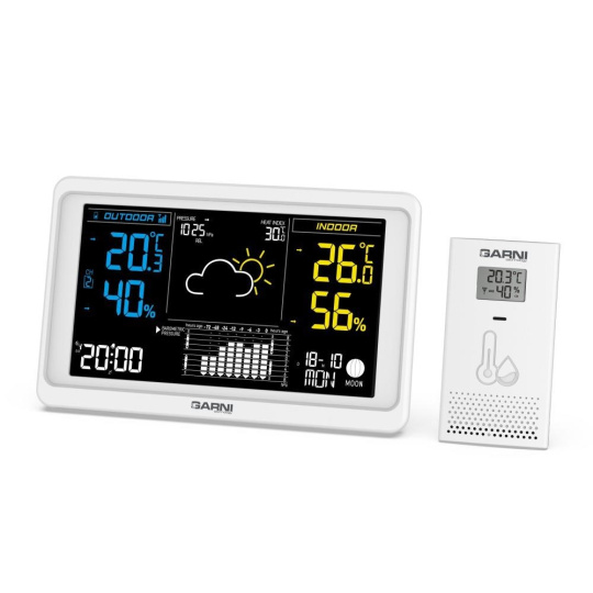 Presná meteorologická stanica s inverzným farebným VA displejom s časom a dátumom riadenými rádiovým signálom DCF-77, budíkom, meraním vnútornej teploty, relatívnej vlhkosti, barometrického tlaku a bezdrôtovým čidlom na meranie vonkajšej teploty a relatívnej vlhkosti. Pre dosiahnutie vysokej presnosti merania teploty a relatívnej vlhkosti sú použité špičkové senzory švajčiarskej značky SENSIRION