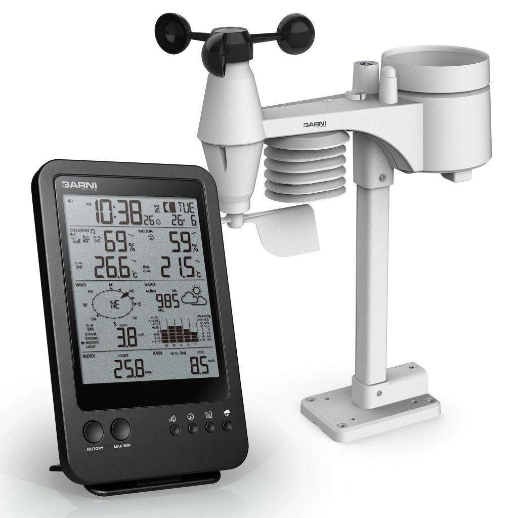 Meteorologická stanica s predpoveďou počasia, meraním vnútorných a vonkajších teplôt, relatívnej vlhkosti, barometrického tlaku, rýchlosti a smeru vetra, dažďových zrážok, UV indexu a intenzity slnečného žiarenia ? LCD displej o rozmeroch 90 x 110 mm ? možnosť krátkodobého osvetlenia displeja oranžovou farbou na 5 s ? veľkosť číslic na displeji - čas 15 mm, dátum, skratka názvu dňa 6,5 mm, vonkajšia a vnútorná teplota a relatívna vlhkosť 12,5 mm, barometrický tlak 8 mm, rýchlosť a náraz vetra 11 mm, skratka smeru vetra 5 mm, zrážky, UV index, intenzita slnečného žiarenia, pocitová teplota, Wind Chill, teplotný index, rosny bod 10 mm ? čas a dátum riadené rádiovým signálom DCF-77 s možnosťou manuálneho nastavenia ? skratka názvu dňa ? 12 alebo 24 hodinový formát zobrazenia času ? ikona príjmu signálu DCF-77 ? časová zóna +/- 23 hodín ? budík s funkciou opakovania buzenia (Snooze) ? buzenie zvukovým signálom (4 sekundy 1 pípnutie za sekundu, 4 sekundy 2 pípnutia za sekundu, 4 sekundy 3 pípnutia za sekundu a potom stále 4 pípnutia za sekundu) ? funkcia budíka Pre-alarm - budík sa aktivuje o 30 minút skôr, ak bude vonkajšia teplota nižšia než -3 °C ? fáza Mesiaca ? meranie vnútorných teplôt a relatívnej vlhkosti s ikonou tepelnej pohody ? meranie vonkajších teplôt, relatívnej vlhkosti, rýchlosti a smeru vetra, srážok, UV indexu a intenzity slnečného žiarenia integrovaným senzorom 7-v-1 ? integrovaný senzor 7-v-1 používa pre meranie teplôt a relatívnej vlhkosti švajčiarske senzory SENSIRION ? možnosť použitia ďalších 3 bezdrôtových senzorov pre meranie teplôt a relatívnej vlhkosti GARNI 055H a bazénového senzora GARNI 057P pre meranie teploty vody (voliteľné príslušenstvo) ? zobrazenie teploty vo °C alebo °F ? šípky vývoja vnútorných a vonkajších teplôt a relatívnej vlhkosti ? možnosť automatického prepínania zobrazenia vonkajšej teploty a relatívnej vlhkosti nameranej integrovaným senzorom 7-v-1 a voliteľnými pripojenými bezdrôtovými senzorami po 4 sekundách ? meranie priemernej rýchlosti vetra za posledných 12 s, nárazov vetra a smeru vetra aktuálneho a za posledných 5 minút, 16 rozlíšení smeru ? zobrazenie rýchlosti vetra v Beaufortovej stupnici ? textový popis úrovne sily vetra (LIGHT – ľahký, MODERATE – mierny, STRONG – silný, STORM – búrka) ? zobrazenie rýchlosti vetra a nárazov vetra v m/s, km/h, knots (uzle), alebo mph ? zobrazenie smeru vetra skratkou (16 skratiek), alebo vo stupňoch (360°) ? meranie dažďových srážok - aktuálne (za poslednú hodinu), hodinový úhrn, denný úhrn, týždenný úhrn, mesačný úhrn a celkový úhrn ? zobrazenie úhrnu dažďových srážok v mm alebo in (palcoch), aktuálna hodnota v mm/h alebo in/h ? 6 animovaných ikon predpovede počasia (slnečno, polooblačno, oblačno, dážď, búrky, sneženie) ? meranie barometrického tlaku, zobrazenie absolútneho alebo relatívneho barometrického tlaku ? zobrazenie hodnoty barometrického tlaku v hPa, inHg alebo mmHg ? stĺpcový graf vývoja barometrického tlaku za posledných 24 hodín ? zobrazenie hodnoty UV indexu, intenzity slnečného žiarenia, vonkajšej pocitovej teploty, Wind Chill, teplotného indexu a rosného bodu ? zobrazenie intenzity slnečného žiarenia v luxoch, fc alebo W/m2 ? možnosť kalibrácie UV indexu a intenzity slnečného žiarenia ? pamäť na namerané hodnoty vnútorných a vonkajších teplôt a vlhkostí, hodnoty barometrického tlaku, hodnoty Wind Chill, rýchlosti vetra vrátane času a dátumu merania za posledných 24 hodín po hodine ? zobrazenie maximálnych a minimálnych hodnôt vnútorných a vonkajších teplôt a relatívnej vlhkosti, pocitovej teploty, Wind Chill, teplotného indexu, rosného bodu, barometrického tlaku, maximálnej priemernej rýchlosti a nárazov vetra a maximálnych intenzít srážok, maximálneho UV indexu, maximálnej hodnoty intenzity slnečného žiarenia s časom a dátumom záznamu ? alarm horných a dolných mešien vnútorných a vonkajších teplôt a relatívnej vlhkosti vrátane ďalších senzorov ? alarm hornej meze hodinového úhrnu srážok ? alarm hornej meze rýchlosti vetra ? indikácia dosiahnutia hornej alebo dolnej meze zvukovým signálom a blikajúcou ikonou ? indikácia slabých batérií hlavnej jednotky, integrovaného bezdrôtového senzora 7-v-1 a ďalších prídavných bezdrôtových senzorov ? indikácia sily signálu integrovaného bezdrôtového senzora a prídavných senzorov ? farba čierna ? rozmery hlavnej jednotky bez stojanu 118 x 192,5 x 21 mm ? napájanie 3 ks AA batérií 1,5 V Integrované bezdrôtové senzory 7-v-1 model GARNI 6INT ? vodotesný integrovaný bezdrôtový senzor 7-v-1 (teplota, relatívna vlhkosť, rýchlosť vetra, smer vetra, dažďové zrážky, UV index, intenzita slnečného žiarenia) ? dosah signálu integrovaného bezdrôtového senzora až 150 m v otvorenom priestore ? prenos signálu na frekvencii 868 MHz ? vodováha ? radiačný štít ? farba svetlosivá, misky rýchlosti vetra čierne ? rozmery 343,5 x 393,5 x 136 mm ? napájanie 3 ks AA batérií 1,5 V Obsah balenia: 1 x hlavná jednotka 1 x integrované bezdrôtové senzory 7-v-1 1 x stojan hlavnej jednotky 1 x montážna základňa integrovaného bezdrôtového senzora 1 x stojan integrovaného bezdrôtového senzora 1 x montážna objímka integrovaného bezdrôtového senzora 4 x dlhší skrutka, 4 x matice, 4 x ploché podložky, 2 x kratšie skrutky, 2 x menšie matice, 2 x gumové podložky český, slovenský, anglický, nemecký, holandský, poľský a maďarský návod