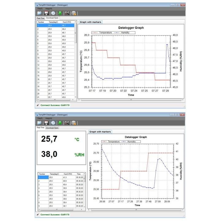 USB datalogger na meranie a zaznamenávanie teploty a relatívnej vlhkosti LCD displej o rozmeroch 18 x 7 mm zobrazenie na displeji - teplota, alebo relatívna vlhkosť pamäť na 32 000 dát (16 000 pre teplotu a 16 000 pre relatívnu vlhkosť) interval záznamu: od 2 sekúnd do 30 sekúnd po jednej sekunde, ďalej 1, 5, 15, 30 minút, 1, 5, 12, 24 hodín zobrazenie rosného bodu zobrazenie stavu LED diódami pripojenie k počítaču cez USB port software TempRH Datalogger V2.4 na zobrazenie nameraných hodnôt, na sťahovanie dát, nastavenie dataloggeru a tvorbu grafov pracuje pod operačným systémom Windows 7, 8, 10 a 11 možnosť nastavenia parametrov záznamu možnosť nastavenia signalizácie dosiahnutia hornicej a dolnej hranice teploty a relatívnej vlhkosti zobrazenie nameraných dát v reálnom čase v priloženom programe vrátane grafu možnosť odloženého začatia merania dáta vo forme tabuľky vo formáte *.csv a vo formáte *.imtr (Meter Files - je možné otvoriť priloženým programom) batéria s dlhodobou výdržou balenie obsahuje: datalogger s krytom a držiakom, CD s programom, český návod, batériu 3,6 V, lítiovú (1/2 AA)