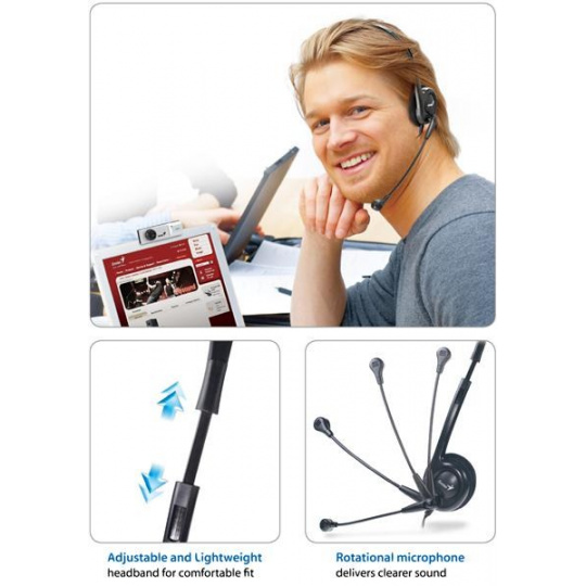 | Popis produktu: • Nastaviteľná veľkosť • Mäkké náušnice • Otočný mikrofón • Vhodné pre MSN, SKYPE a chatovanie na internete Frekvenčný rozsah: 20Hz~20KHz Citlivosť slúchadiel: 105dB Impedancia (@1KHz): 32ohm Dĺžka kábla: 1.8m Citlivosť mikrofónu: -38dB Rozhranie: 3.5mm jack Ovládanie hlasitosti: Nie Hmotnosť: 57g